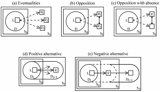 Negation has many possible targets, e.g., quantity (no water), property (uneven), type of thing (non-argument), and existence (lack, missing, empty). I start in Figure 6 with a general characterization based on fundamental aspects of cognition. Let us say that a particular conception, at a given moment, constitutes a domain (D). Any facet of D can be the locus (L) of processing activity serving to update it in some respect. This constitutes elaboration (L being the baseline). From this initial stratum (S0), alternate paths of elaboration—referred to here as eventualities (e)—define a higher stratum (S1) comprising a wider range of options. For instance, D might be the conception of a table, and L the specification of its shape. The eventualities are then an array of conceivable shapes (e.g., round, square, rectangular, octagonal). When alternatives are incompatible (e.g., round vs. square), their relation is one of opposition, indicated by the notation in Figure 6b. In processing terms, they consist in patterns of activity that inhibit one another. And as shown in Figure 6c, there is always an implicit opposition between a given eventuality and its absence (so that L is the same at S0 and S1).