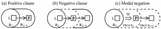 In Figure 7b, its negative counterpart, the reality of p (its location in R) is merely provisional (or virtual); it is invoked as a basis for arriving at the actual situation, where it is absent from Ri+1. In the case of modals, shown in Figure 7c, what counts as reality is PROJECTED REALITY (PROJ R). So the updated conception—where p is absent—pertains to PROJ Ri+1.