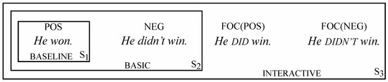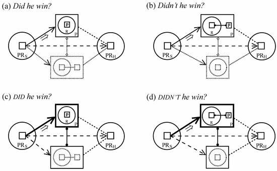Both positive and negative questions are subject to elaboration by means of polarity focusing, as in Figure 13c,d. In both cases this is marked by accentuation of the finite verb in the overtly specified alternative (Did he win? vs. Didn’t he win?). Polarity focusing has the same basic effect in statements and in questions: it reinforces the idea that the chosen alternative is the one whose status is being negotiated. In so doing, it renders the other alternative a bit more salient by underscoring the fact that a choice is involved.