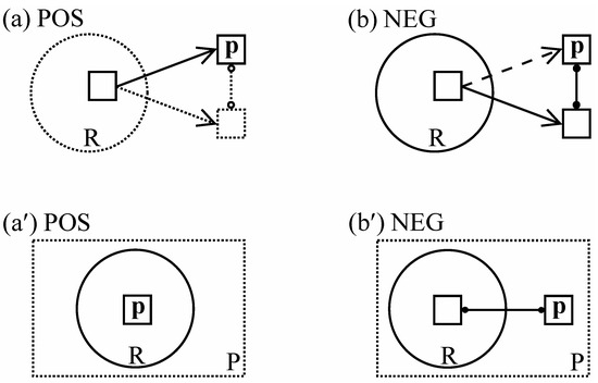 While negotiation (broadly conceived) is always a factor in language use, it is minimal in a simple positive statement (like he won) whose validity is not at issue. In Figure 10a, dotted lines indicate features of the substrate—reality and the negative alternative to p—that are taken for granted and left implicit (cf. Figure 6c). On the other hand, a negative statement necessarily invokes the positive alternative, for without it there is no indication of what is being negated (cf. Figure 6e). Accordingly, the notation in Figure 10b indicates that both alternatives are active, with a solid (rather than a dashed) arrow indicating the option actually chosen. Although a negative statement chooses the option of p being absent from R, its absence is conceived in relation to its presence. This evocation of alternatives (raising the issue of choosing between them) correlates with do—instead of the lexical verb—assuming the role of finite verb: he didn’t win (rather than *he won not).