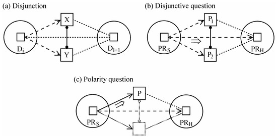 Simple polarity questions (e.g., did he win?) are like disjunctive questions except that only one option is made explicit, as indicated by the solid-line box and arrow in Figure 12c. One is enough because the two eventualities are polar opposites: just P vs. its absence, rather than distinct propositions requiring separate specification. The explicit alternative presents the proposition (P) whose validity is being queried, calling on the hearer to either confirm or deny its presence in PRH. Usually P is positive (did he win?), that being the baseline. Negative questions (didn’t he win?) are not uncommon, but they often invoke a more elaborate interactive substrate (beyond the scope of this discussion).