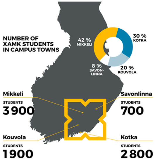 The affiliation of the authors of this article is South-Eastern Finland University of Applied Sciences (Xamk). Xamk is the 5th largest university of applied sciences in Finland and it operates in four towns: Kotka, Kouvola, Mikkeli and Savonlinna. The distance between the farthest campuses (Kotka and Savonlinna) is 260 km (Figure 2).