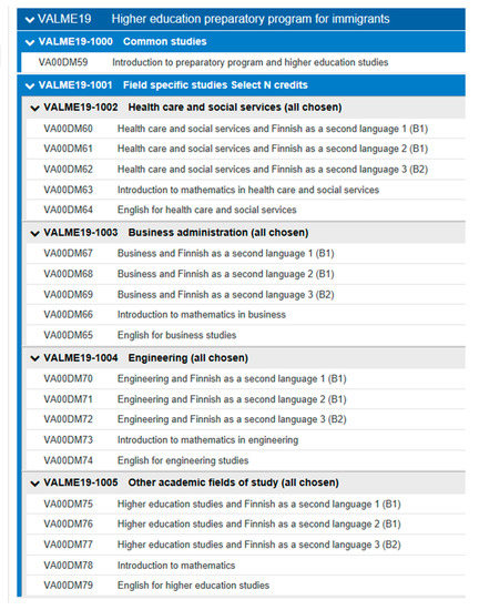- Lepola, Laura. 2017. Ammattikorkeakoulujen Maahanmuuttajille Järjestämä Korkeakouluopintoihin Valmentava Koulutus Vuosina 2010–2017. Kansallinen Koulutuksen Arviointikeskus. Julkaisut 2017: 15. Available online: https://karvi.fi/app/uploads/2017/06/KARVI_1517.pdf (accessed on 14 December 2018).