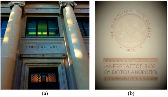 (a) Main doorway to the Sparks Building at the Pennsylvania State University. This image is sharable under Creative Commons (); (b) Located in the foyer of the Sparks Building, this commemorative plaque directly faces anyone entering the main doorway. The school’s official name was Pennsylvania State College from 1874–1953. This image was photographed by the author.