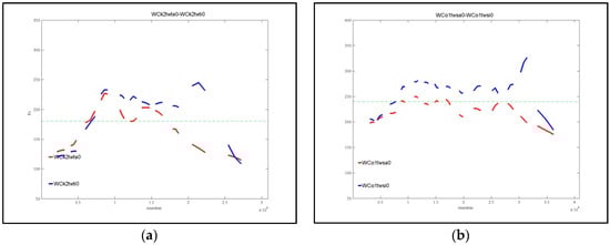 (a) Average of F0 from La guitarra se toca con paciencia (‘The guitar is played with patience’) pronounced as a declarative sentence (WCk2twta0, the curve in red) and as an interrogative sentence (WCk2twti0, the curve in blue) by a man from Las Palmas de Gran Canaria; (b) Average of F0 from La guitarra se toca con paciencia finita (‘The guitar is played with finite patience’) pronounced as a declarative sentence (WCo1twsa0, the curve in red) and as an interrogative sentence (WCo1twsi0, the curve in blue) by a woman from La Gomera.