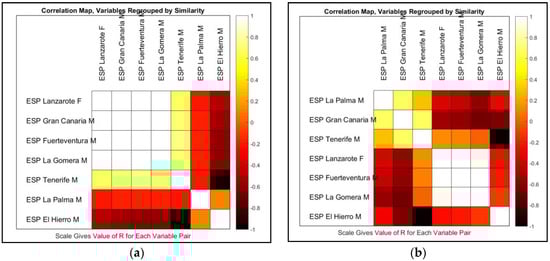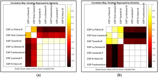 Figure 3a,b represents graphically simple sentences correlation matrices (SVO) by survey areas as well as those with expansion in the object (SVO + Exp). Correlation maps rearrange these areas by similarity and allow us to display in a scale on the right the numerical value of the correlation index resulting from the contrasts analysed. The value oscillates in the interval between 1 and −1 (a value of 0 indicates that there is no relationship between the variables). As can be seen in Figure 3a,b, positive values are associated with lighter colours until 1 is reached, which indicates a perfect positive correlation (for example, if La Palma is contrasted with itself, then the value is 1 associated with the white colour). By contrast, negative values are associated with darker colours until a maximum of −1 is reached (black colour), which is viewed as the maximum value of dissimilarity.