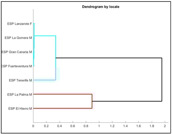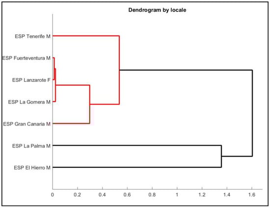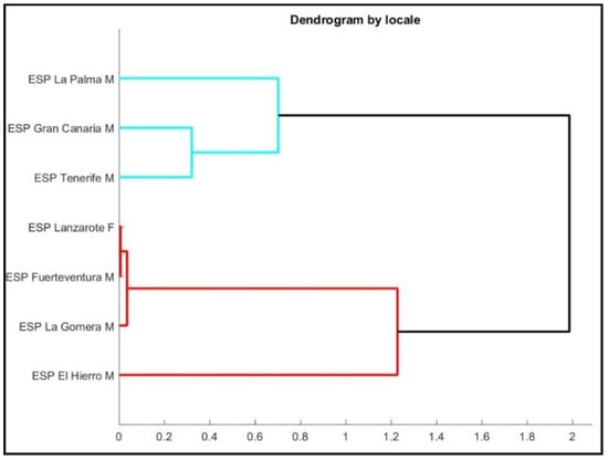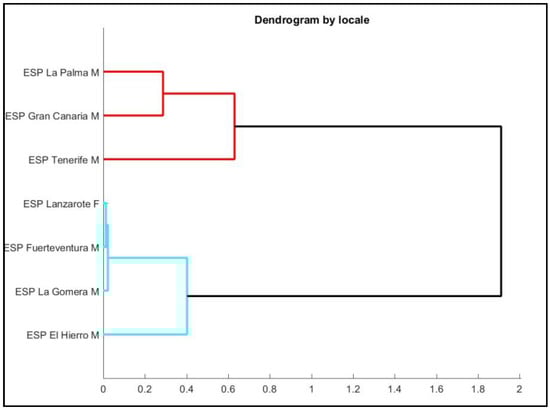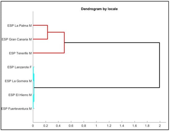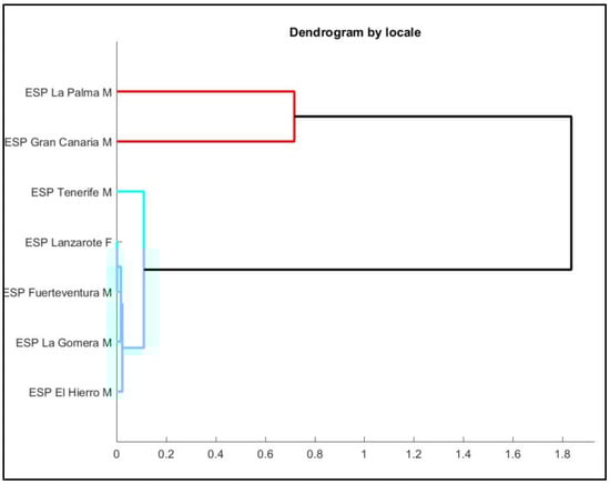 In the SVO sentences (Figure 4), two clusters are clearly established at a distance of 0.8. The first cluster includes five of the seven islands, that is, Tenerife, Lanzarote, Fuerteventura, La Gomera and El Hierro. The second cluster includes La Palma and Gran Canaria, more distant from the other five islands. However, if we take into consideration intracluster differences, it should be emphasised that the islands in the first cluster are brought together at a distance of 0.2 or less, so the distance between them is very short or non-existent. Instead, La Palma and Gran Canaria are less close to each other so if we make a cut at a distance of 0.6 they should be separated into different clusters.
