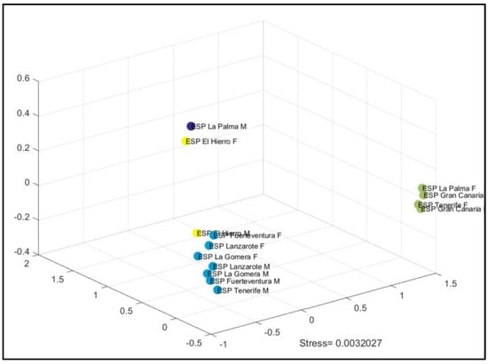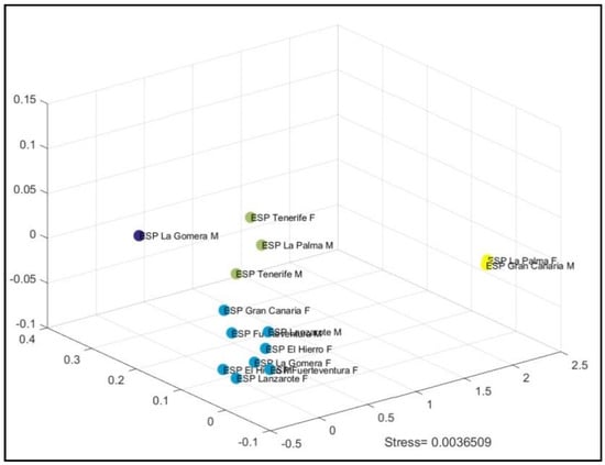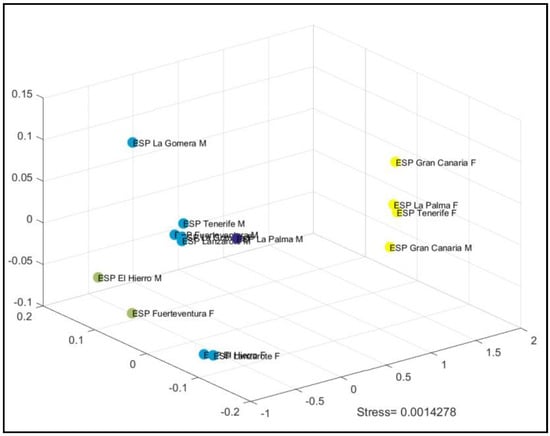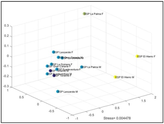 As Figure 6 and Figure 7 show, the stress values (which give the reliability of the graphical representation) are very good (0.003 and 0.001) since the closer they get to 0 the more suitable they are ( suggested the following interpretations: 0.2, Poor; 0.1, Acceptable; 0.05, Good; 0.025, Very Acceptable; and 0.0, Excellent).