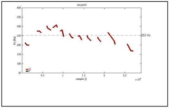 (a) Without expansion: In this case, the sentences have a basic structure S + V + O (subject, verb, object) where S and O are formed by three-syllabic words stressed on the last syllable, on the penultimate syllable, and on the antepenultimate syllable. Each informant issued 27 sentences (9 × 3 repetitions) in each modality. An example of the tonal curve (in Hz) of the two modalities of this type of corpus can be seen in Figure 2a.