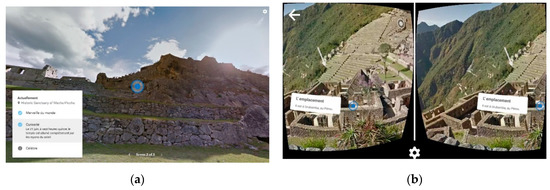Google Tour Creator (Google LLC, Mountain View, CA, USA, vr.google.com/tourcreator) visualization screen of a student created tour: (a) Desktop internet browser screen; (b) Smartphone internet browser screen in VR mode.