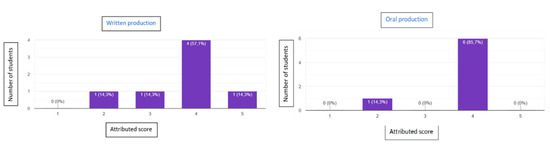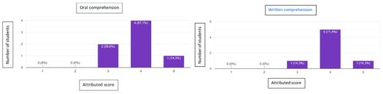 Students from F1 also answered a question about their sense of immersion during the last activity, in which 75% of students attributed a score of 4 and 25% a score of 5. As for the four linguistic competences, when asked to give a score from 1 to 5, most students attributed 4 and 5 to the effectiveness of linguistic production and comprehension competences during the activities with VR.