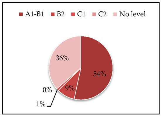 Our survey was conducted in a population of 152 students3, out of which 88 were the final participants in the sample. In total, 69% of the participants were female while the remaining 31% were male students (this gender gap reflects the disparity that can accurately be observed in Law students at the university we are analysing). They were aged from 19 to 51 years old and they were all studying the Law Degree in the Faculty of Law at the University of Cádiz4. Regarding their English language proficiency, most surveyed students reported an accredited an English level which ranged from A1 to B1 (54%) according to the Common European Framework of Reference for Languages (CEFR). From the remaining percentage, 9% had a B2 accreditation and only 1% reached C1. No one had more than a C1 accredited and there were 36% of the surveyed students who still had no FL certificate (Figure 1). At this point, it is significant to highlight that all students at the University of Cádiz (and most universities around Andalusia and Spain) must certify a B1 level of English or any other FL (certain studies require specific languages, as it is the case of the Degree in Business) before obtaining their diploma upon graduation. That implies that 36% of students who, being in the last semester of their undergraduate studies, need to be particularly interested in developing their English language skills, as they will soon be asked to certify their B1 level of English.