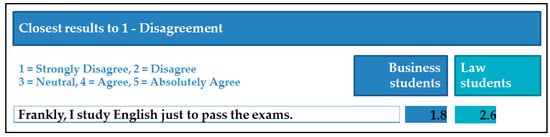 The participants in the survey were given a list of statements so as to identify their degree of agreement with them by using a Likert scale. Such a scale ranged from 1 to 5, where 1 was “strongly disagree”, 2 “disagree”, 3 “neutral”, 4 “agree” and 5 “absolutely agree”. It must be highlighted that the use of an odd number of options hindered the possibility of obtaining meaningful results and most students avoided to decide upon agreement or disagreement by locating their opinion in the neutral zone. Nonetheless, we would like to draw attention to the statement whose results were closer to 1, meaning strong disagreement. This statement made reference to the surveyed students’ attitude towards learning legal English, as they indicated passing the final exam was not the only motivation they had to study, to come to class and to play an active role in it. This positive attitude towards learning ESP was considerably higher when compared to the results seen in previous studies (). As it can be seen in Figure 4, business students were clearly convinced that they had other prevailing motivations to take part in the ESP course which were much more important to just passing the final exam.