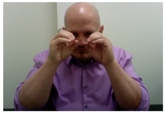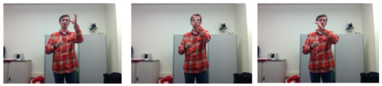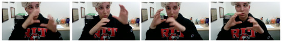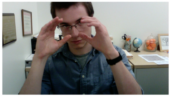 Eleven M2L2 (second language second modality) students, eight males and three females, were recruited from first semester ASL 1 classes. At the time of the first recording, the students were monolingual English speakers who had not studied a second spoken language. Participants ranged in age from 18 to 44 years old. Protocol for this research was approved by the National Technical Institute of the Deaf’s Institutional Review Board, according to the ethical guidelines laid out by the governing body, in accordance with the Declaration of Helsinki. Participants completed both an informed consent form and a video-release form agreeing to participate in the study and agreeing to allow researchers to share their video data for presentation, publication, and teaching purposes. Participants who did not wish to have their video data released but who gave informed consent were allowed to participate in the study. Their data was collected and used for analysis but their videos were not used for the creation of still-images or presentation of data in the public-SPHERE.