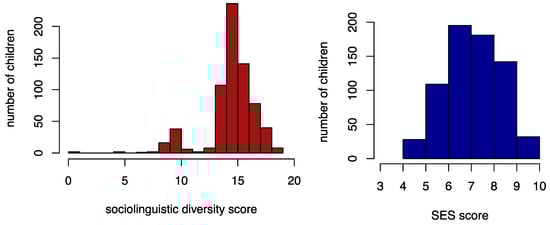 Distribution of the scores on sociolinguistic diversity (left graph) and socio-economic status (SES, right graph), based on the questionnaires.