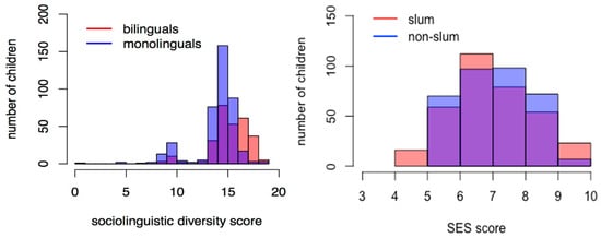 Distribution of the scores of sociolinguistic diversity for bilinguals and monolinguals (left graph) and socio-economic status (SES) for children from schools in slum and non-slum areas (right graph). Purple areas reflect the overlap between the two groups on the sociolinguistic diversity or SES scores.