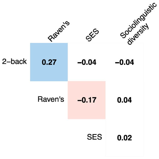 In addition, we examined whether the scores on the different cognitive tasks correlate with each other, and whether the scores on the questionnaires correlate with each other. The results are presented in Figure 3. We found a significant negative correlation between Raven’ score and SES score (r = −0.17, p < 0.001), indicating that children with higher SES had lower Raven’ scores, reflecting more interactions in different languages. An additional positive correlation was found between children’s scores on the 2-back task and their scores on the Raven’s task (r = 0.27, p < 0.001), indicating that performance on the two cognitive tasks was related.