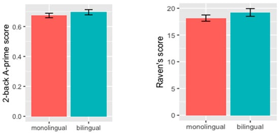 Overview of the positive correlations between bilingualism and cognitive scores; 2-back score in the left graph and Raven’s score in the right graph.
