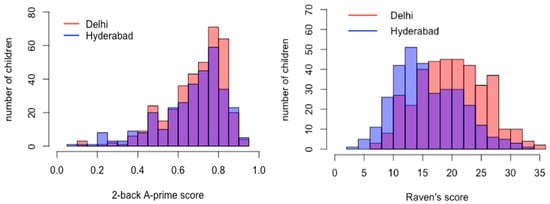 Distribution of scores on the 2-back task (left graph) and on the Raven’s task (right graph) for children from Delhi and Hyderabad. Purple areas reflect the overlap between the children from the two cities on the 2-back and Raven’s scores.