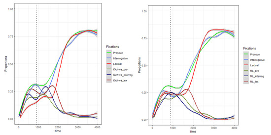 After eliminating incorrect responses by visually inspecting the replay video files, the output data from the eye-tracking system were analyzed in R2, and the point at which the proportion of gazes to the target image as opposed to the non-target reached statistical significance was determined with the eyetrackingR package (Dink and Ferguson 2015), using the bootstrapping option with 1000 resamples (the basic t-test, t-test with Bonfaronni correction, and Holm’s test were also measured and in most cases were very close to the bootstrapped values). From the point at which gaze proportion to the target reached significance, a conservative value of 200 ms was subtracted to account for the time generally required to initiate a language-triggered saccade (Altmann 2011) in order to identify the word that had triggered the gaze to the target. The audio files were imported into PRAAT (Boersma and Weenink 1999–2005), and by means of a script, the appropriate points of language recognition were located on the corresponding text grids. The overall results are presented in Table 1 and Figure 1. There were no significant differences between Quichua and Media Lengua for any of the categories. Interrogatives and subject pronouns following the language-neutral carrier phrases triggered significant gaze shifts to the target images immediately after the key items (100%), while gazes to the targets were sometimes delayed when a lexical item immediately followed the carrier phrase (40%).