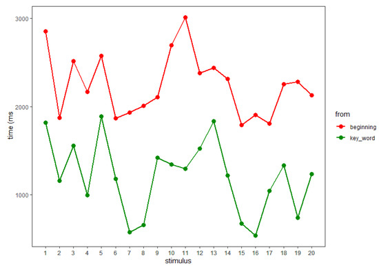 An anonymous reviewer has suggested that because all of the language switches occurred towards the middle of each utterance, participants might have gradually come to expect a switch mid-way, thus possibly blurring the effects of individual words at the switch-points. In Figure 5, the significant switch-response times from the beginning of the stimulus and the offset of the key items show no such tendency, although some implicit anticipation may have occurred. The only factor that significantly modulated response time was the grammatical category of the item immediately preceding the switch, as shown in Figure 4.