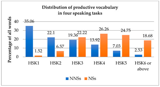 Distribution of words produced by second language (L2) learners (NNSs) and native speakers (NSs) based on the Hanyu Shuiping Kaoshi (HSK) difficulty ranking.