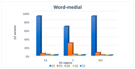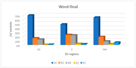 Table 1 shows that in word final position there were five different realizations of /s/, namely, a voiceless predorso-alveolar sibilant [s] (60.5%), aspirated [h] (19.8%), deleted [∅] (15.8%), voiced predorso-alveolar sibilant [z] (2.3%), and voiceless apico-alveolar sibilant [] (1.6%). In word medial position, /s/ was realized as a voiceless predorso-alveolar sibilant [s] (82.1%), aspirated /h/ (14.6%), deleted [∅] (2.1%), voiced predorso-alveolar sibilant [z] (1.1%), and voiceless apico-alveolar [] (0.2%).