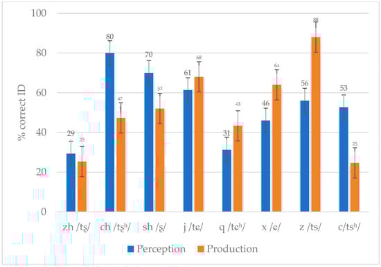Visual inspection of Figure 1, which compares the mean percentage correct perception and production scores of the eight consonants, shows the patterns of higher scores in perception than in production for retroflex sounds zh/tʂ/, ch/tʂʰ/, and sh/ʂ/ but vice versa for palatal sounds j/tɕ/, q/tɕʰ/, and x/ɕ/. The dental affricates were mixed as c /tsʰ/, the aspirated dental affricate received the lowest production score of 25% while the unaspirated counterpart z/ts/ had the highest production score of 88%.