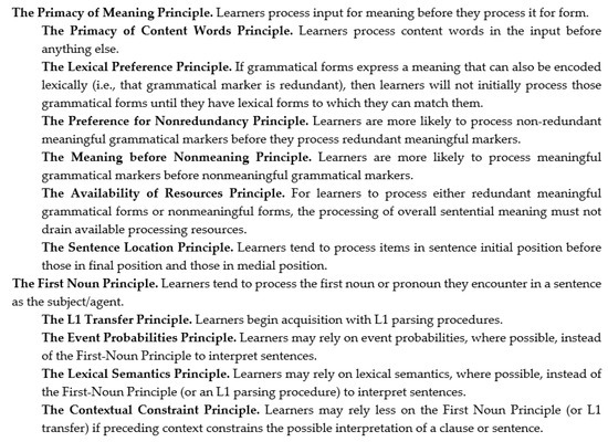 VanPatten (1997) developed a series of processing principles to illustrate the learners’ faulty strategies when processing grammatical information. These principles have since been reviewed and expanded (VanPatten 2004, 2015) and are listed in Figure 2: