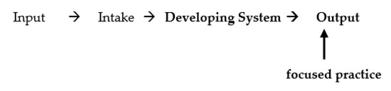 To complement his theory, VanPatten developed a pedagogical model named Processing Instruction (VanPatten and Cadierno 1993a, 1993b; VanPatten and Williams 2015; Wong 2002, 2004). Processing Instruction (PI) consists of a grammatical instruction model focused on input, which aims at driving learners away from their nonoptimal processing strategies and pushing them to make better form–meaning connections. While traditional explicit grammar instruction focuses practice at the stage of active production (see Figure 3), PI aims to train input information to convert it into intake (see Figure 4).