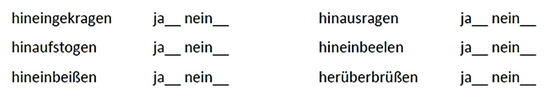 The lexical decision task was solely used in the pretest and aimed at assessing the level of language proficiency of the participants by means of determining their vocabulary size with regards to the target form. The task consisted in a modified version of the Dialang Vocabulary Placement Test (see Alderson 2005) and presented 50 verbs with double particles, 25 of which were invented. For the non-existing words, only the verbs were invented, the particles remained correct (see Figure 5). The group was, therefore, meant to determine whether the word existed or not (see Appendix A).