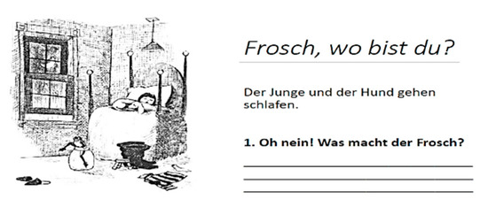 To test their production of the double particles in both the pretest and the posttest, the participants were presented with an image-induced production task based on the volumes Frog, Where Are You? (Mayer 1969) in the pretest (see Figure 6), and A Boy, a Dog and a Frog (Mayer 1967) in the posttest, from Mercer Mayer’s acclaimed series Frog Stories3. The task consisted of eight questions related to several illustrations from the book in which the participants were prompted to produce movement structures to describe the events happening in the pictures (see Appendix B). The notion of perspective (hin- and her-) was ignored in this task, since it rests on the speaker’s viewpoint and is not clear in indirect speech: