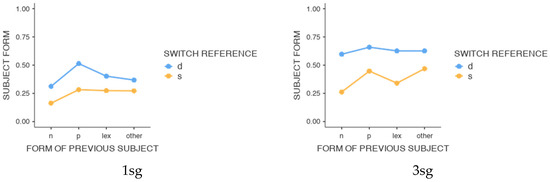Interaction of switch reference and form of previous subject in the use of overt pronominal subjects in 1sg (left) and 3sg (right).