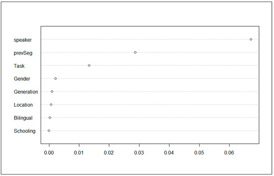 Conditional permutation variable importance for the random forest with all predictors of rhotic assibilation.