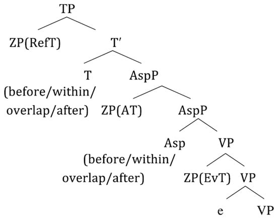 2000) extended this proposal to provide a uniform representation of both tense and viewpoint aspect. In this representation, ordering predicates in the head of the Aspect phrase (AspP) and the Tense phrase (TP) order the event time (EvT), in the specifier of the verb phrase (VP), and the assertion time (AT), in the specifier of AspP (yielding viewpoint aspect), and the AT and the reference time (RefT), in the specifier of TP (yielding tense). This proposal is represented in