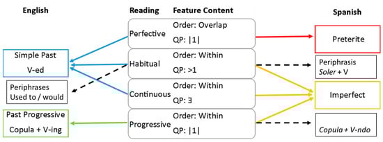 Figure 2, periphrastic forms are available for habitual readings in both languages, and a dedicated past progressive form also exists in Spanish (“Copula + V-ndo”). Nonetheless, the difference in form–meaning mappings between the two languages clearly demonstrates a difference in feature configuration between Spanish and English. Specifically, whilst both languages associate perfective and progressive readings with different morphological forms, the habitual and continuous readings are associated with the simple past in English and the imperfect in Spanish (see