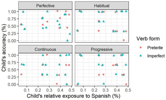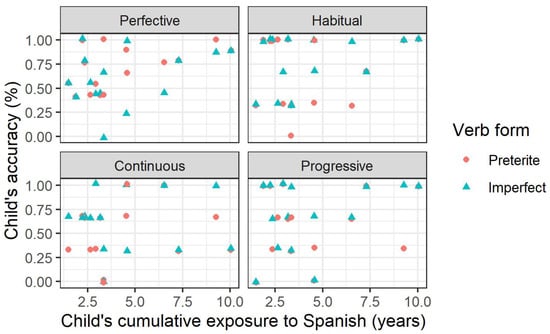 As was the case for relative exposure, none of the Spearman’s rank correlations were significantly different from 0. Again, this suggests that there is no relationship between the total amount of input the children have received in Spanish lives and their accuracy with the preterite–imperfect contrast. The accuracy at accepting the preterite in perfective contexts was trending towards significance (p = 0.077), which may suggest that a larger sample with more test items may find a statistically significant difference in this context. However, the fact that this is not likely to be the case for the remaining accuracy rates suggests that cumulative exposure is not a reliable predictor for accuracy.