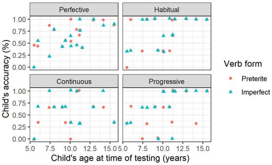 2015) observed that accuracy with the preterite morpheme was generally similar for all of the children, whereas the accuracy with the imperfect morpheme increased substantially with age. However, they did not test whether there was a meaningful correlation between each child’s age at time of testing and their accuracy.
