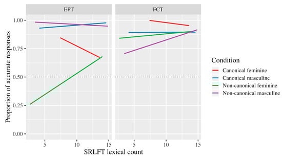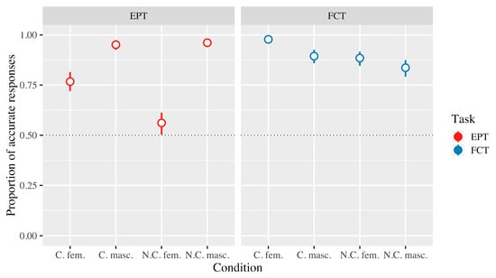 | 2 | An anonymous reviewer pointed out that masculine was more difficult in the FCT. We do not have an explanation for this fact. We can only speculate that the FCT may have been a more difficult task in that participants had to evaluate two options and this may have generated more difficulty in the responses involving the default value. |