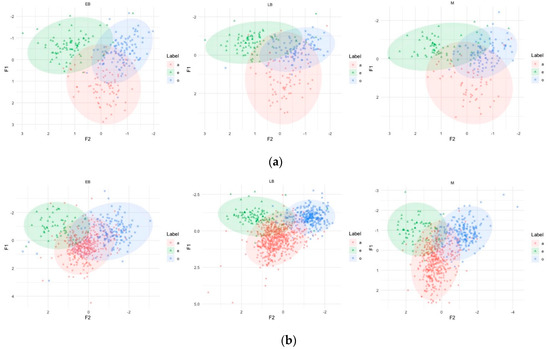 Formant charts for /a e o/ in all groups (Early Bilinguals (EB), Late Bilinguals (LB) and Monolinguals (M)): (a) reading task; (b) narrative.