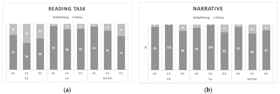 Percentage of diphthongs and hiatuses by type of vowel sequence and group (horizontal axis): (a) Reading task; (b) narrative.