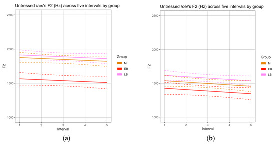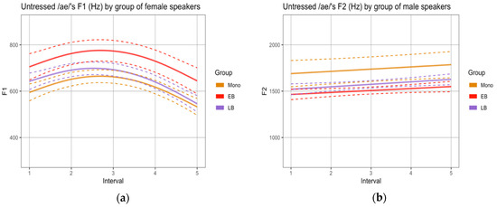 SSANOVAs for non-normalized formant trajectories across five intervals within the sequence /ae/ produced by each group of speakers (M, EB, LB) in the narrative task: (a) F1 trajectories: female speakers; (b) F2 trajectories (male speakers).