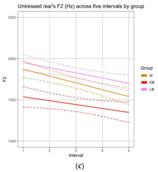 Taken together, these results suggest that the EB group behaves differently from the M and LB groups, often centralizing F2 values in unstressed vowel sequences.