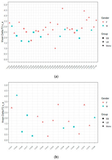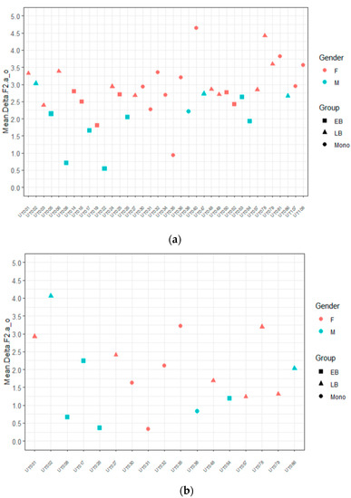 Second, and in order to be able to compare results across tasks, we analyzed the sequences produced by female and male speakers in the narrative separately. SSANOVAs by gender using non-normalized values revealed two statistical differences, both within the sequence /ae/: (i) the female EB group realized F1 trajectories with significantly higher values than the female M group (Figure 4a); and (ii) the male EB group realized F2 trajectories with significantly lower values than the male M group (Figure 4b).11