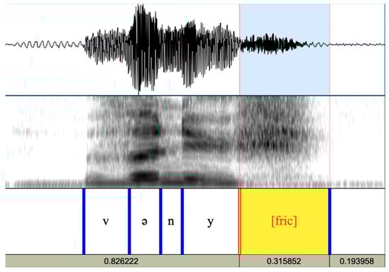 From the resulting recordings, target vowels were identified, delimited, and labeled manually in Praat based on the spectrographic and time displays, beginning at the onset of voicing and formant structure and ending with the end of formant structure. Instances of PFFE were counted as part of the vowel and were included in the overall duration (measured in milliseconds). Each target vowel was then inspected for the presence of PFFE, which was labeled and measured for duration on a separate tier. A derived measure of the fricative-vowel ratio (FVR) was calculated by dividing the length of frication by the length of the full vowel, i.e. the vocalic portion plus frication, as illustrated in Figure 2.