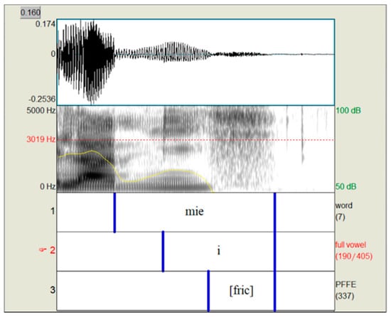 The segmentation of mie ‘crumb.’ With a full-vowel length of 287 ms and a fricative length of 171 ms, the FVR of this token is 59.6%.