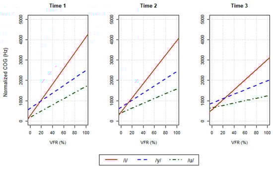 Timepoint 3 (75%). A final model was fit for COG at Timepoint 3, with similar results to those at Timepoint 1 and Timepoint 2, as pictured in Table 4. As at the previous two time points, there was an interaction effect between vowel and FVR (see Figure 3), such that higher PFFE-to-vowel ratios corresponded to higher COG values, with more pronounced differences between COG values at 0% and 100% for /i/ than /y/ or /u/.