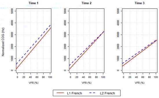 An interaction was also observed between speaker group and FVR, as visualized in Figure 4, such that L2 speakers exhibited higher COG values than L1 speakers at all FVRs, but to a greater extent at lower percentages.