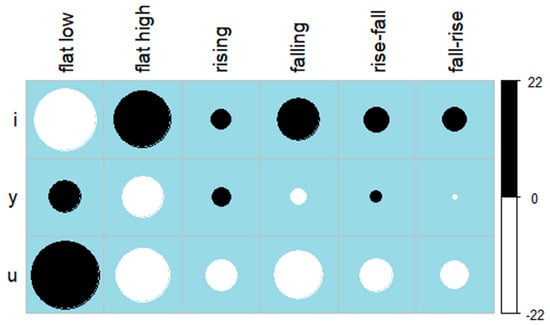 In order to determine whether the different vowels favored different profile types, a chi-square test was conducted on the variables of profile and vowel. This revealed a significant effect for vowel on profile type (χ2(10) = 1555.2, p < 0.0001). As shown in Table 6, the PFFE of /i/ was most frequently realized with a high, flat COG production, or a COG production that began at high values and decreased throughout the course of the vowel. /y/ and /u/, on the other hand, were most often realized with a low, flat PFFE production. This was particularly true for /u/, which was categorized as flat–low 84.8% of the time. The results of the chi-square test are visualized via correlation plot in Figure 5.