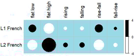 To determine whether L1 and L2 speakers of French favored different profile groups, another chi-square test was conducted on profile and speaker group. This test revealed a significant effect for speaker group (χ2(5) = 29.104, p < 0.0001), such that while both groups used a low, flat frication profile more frequently than any other type, L1 speakers used a flat–low profile more often than L2s, and L2 speakers used a flat–high profile more frequently than L1s (see Table 7). All other profile types appeared to be roughly equal across speaker groups. The results of the chi-square test are visualized in a correlation plot in Figure 6.